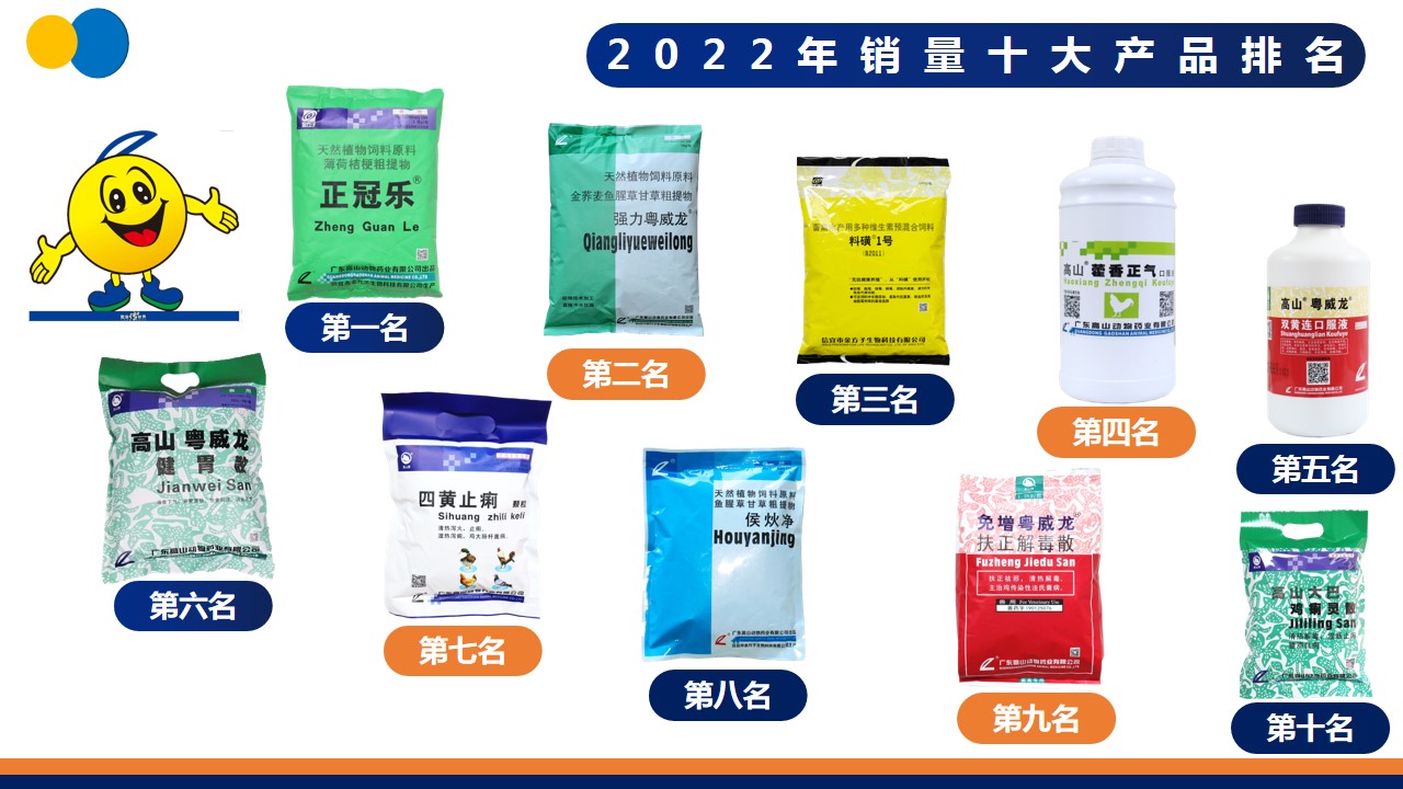 我們秉承求實奮進、守正創新的高山精神,不斷創新,為優質肉蛋奶提供最健康的中藥解決方案!在廣大用戶中贏得了一定的口碑,中藥證侯的解決方案得到了行業人的關注和認可。2022年,排行前列的十大產品有:正冠樂、強力粵威龍、料磺1號、藿香正氣、高山粵威龍、四黃止痢顆粒、侯炏凈、免增粵威龍和高山大巴等,收獲了各位滿滿的認可與支持,一句句感謝,一項項獎項。這既是一種肯定,也是一種鼓勵,更是一種鞭策,是您們的認可讓高山在不斷革新中進步與發展!