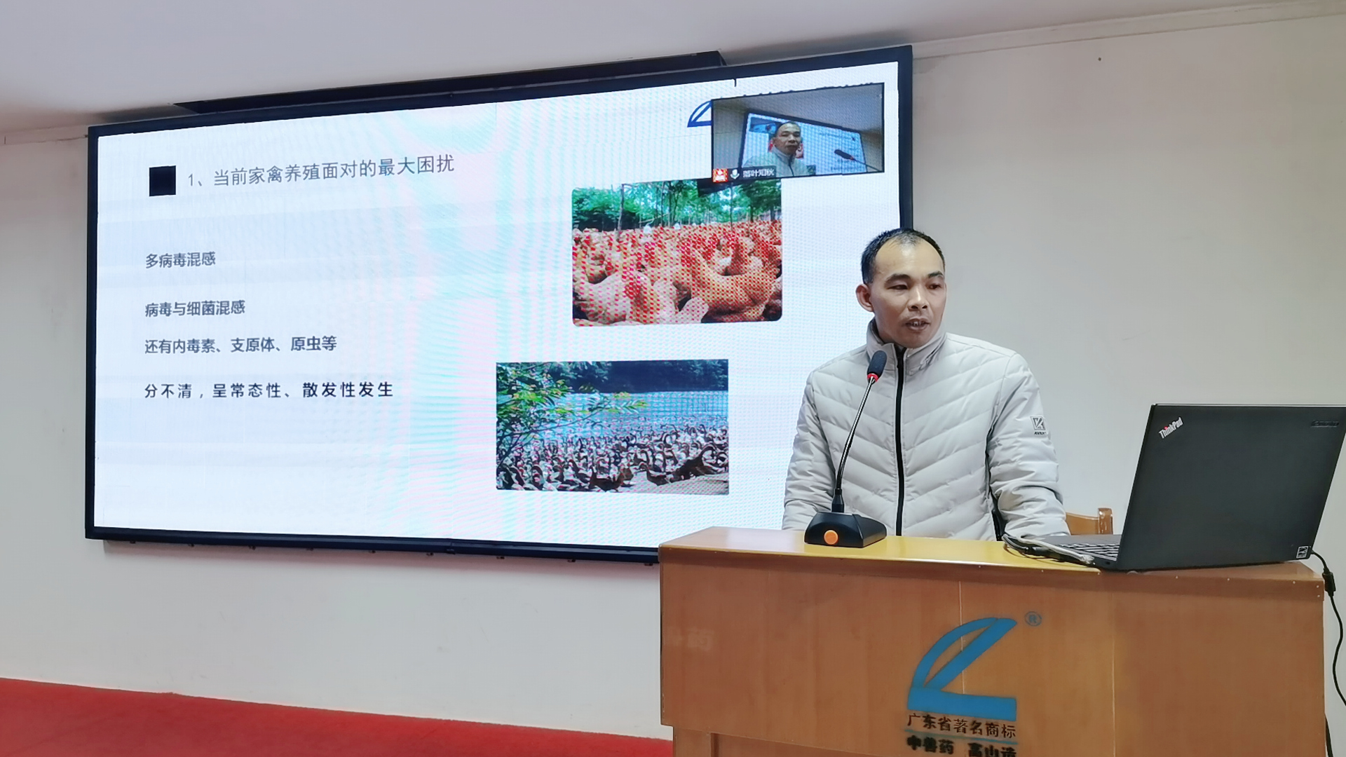 湖南區域營銷經理黎榮宇作《做好畜禽冬春季健康養殖“防御戰”》分享,首先分析了當前養殖存在的狀況,同時講解了高山中藥大健康保健理念,最后分享了一個高山中藥產品就是一個天然證侯的解決方案,例如:一是料磺1號可以解毒、排毒,增強免疫功能;二是免增粵威龍可以提升免疫力,補氣補血;三是正冠樂可以解除正黏、副黏、冠狀、星狀和輪狀等多種病毒混感。