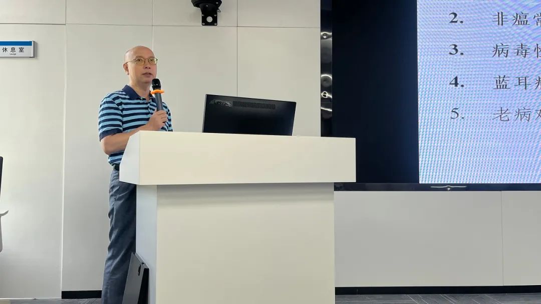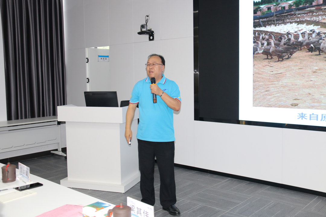 廣東省水禽產業技術體系崗位專家、廣東省農村科技特派員、廣東海洋大學濱海農業學院動物科學系賈汝敏教授作《當前水禽養殖的幾個痛點及對策建議》報告,首先對種鵝在暑熱應激下如何提高生產性能作了詳細的講解,分析了風道散在雛鵝痛風和中藥在預防鴨鵝呼腸孤病試驗成功的案例,同時分享了盛夏預防雛鴨雛鵝“水中毒”可以使用藿香正氣口服液4ml/升水,聯合高山大巴口服液連用3-5天。最后作出如何聚焦現代農業產業園開展合作和中草藥在雞的兩白凈化上是否有潛力可挖的思考。