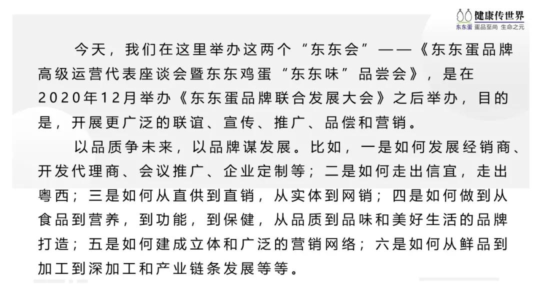會上,與會代表圍繞打造高品質(zhì)的東東蛋、標(biāo)準(zhǔn)化質(zhì)量體系構(gòu)建、品牌營銷與市場推廣、品牌發(fā)展聯(lián)合與產(chǎn)業(yè)化運(yùn)營發(fā)展等方面進(jìn)行了深入探討。