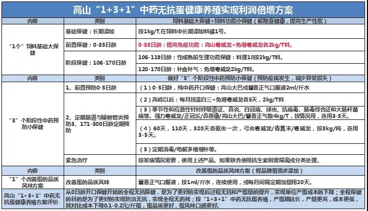 最后是到雞群如何做好預防保健,以高山“1+3+1”中藥無抗健康養殖基礎方案做好基礎保健以及前置保健和階段性保健。