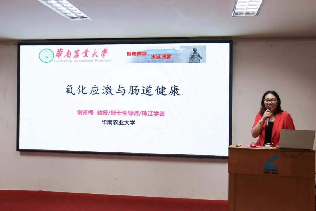 華南農業大學動物科學學院副院長,教授,博士生導師,廣東省高等學校“珠江學者”特聘教授,廣東省家禽產業技術體系首席專家,廣東省畜禽健康養殖與環境控制企業重點實驗室副主任,中國畜牧獸醫學會動物微生態學分會常務理事謝青梅教授作《氧化應激與腸道健康》報告,分別從氧化應激與腸道健康、氧化應激的誘發因素對腸道健康的影響、腸道氧化應激的綜合治療等方面作深刻詳細的闡述。
