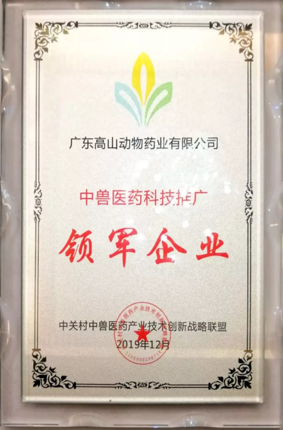 2019年12月14日下午,中關村中獸醫藥產業技術創新戰略聯盟會員大會暨頒獎典禮在北京舉行,廣東高山獲“中獸醫藥科技推廣領軍企業”榮譽稱號。