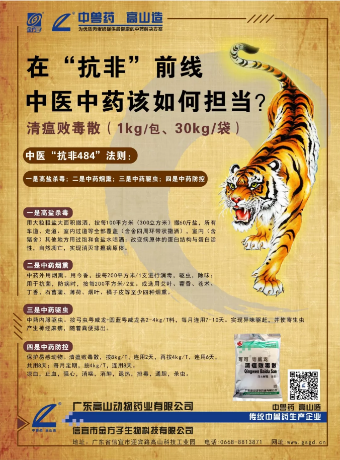 中藥防控清瘟敗毒方案:方案1:清瘟敗毒散或金菲8kg/噸料,連用10天后,再用圓藍粵威龍+弓蟲粵威龍散各按2-4kg/噸料+料磺1號2kg/噸料,連用10天。每月重復。方案2:清瘟敗毒散按8kg/噸料+弓蟲粵威龍2-4kg/噸料,連用10天。每月重復使用。