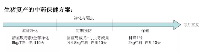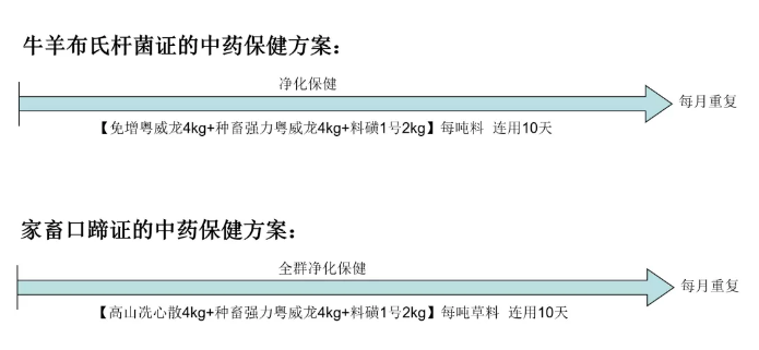 中藥防控清瘟敗毒方案:清瘟敗毒散或金菲8kg/噸料,連用10天后,再用【圓藍粵威龍4kg+弓蟲粵威龍4kg+料磺1號2kg】/噸料,連用10天。每月重復。(如圖)