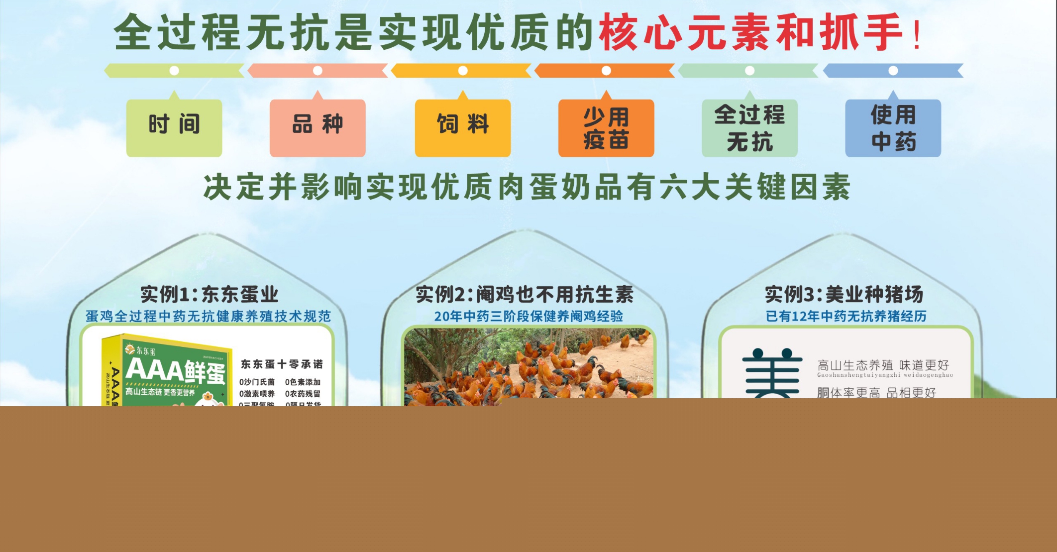 “一退二減三替代”理念,助力國家實(shí)施抗生素減量化行動。而替抗,減抗,都只是過程。從減抗,到短過程無抗,再到全過程無抗,我們最終的目的是為了實(shí)現(xiàn)更加安全、更加健康和更加優(yōu)質(zhì)的肉蛋奶品。而在決定并影響優(yōu)質(zhì)肉蛋奶品的品種、時間、飼養(yǎng)、疫苗、少用抗生素和多用中藥等六大關(guān)鍵因素中,無抗養(yǎng)殖是實(shí)現(xiàn)優(yōu)質(zhì)肉蛋奶品的核心元素(華南農(nóng)業(yè)大學(xué)謝青梅教授語),而全過程中藥無抗又是實(shí)現(xiàn)優(yōu)質(zhì)肉蛋奶品的重要抓手。依托中國原創(chuàng)的中醫(yī)中藥,我們可以做得更好!