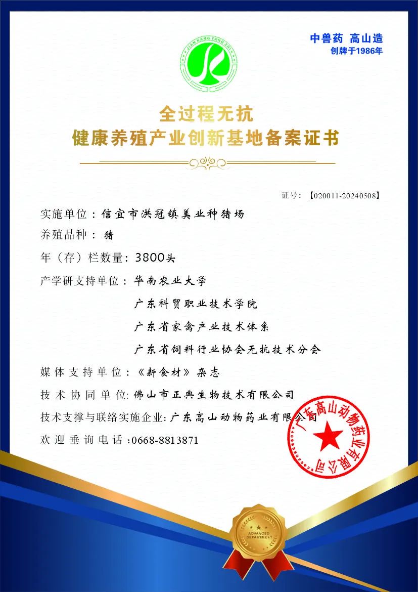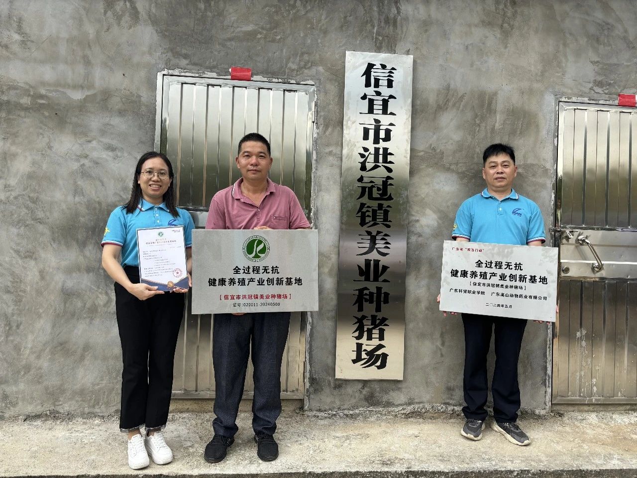2024年5月24日,由廣東科貿(mào)職業(yè)學(xué)院與廣東高山動物藥業(yè)有限公司共同見證,在美業(yè)種豬場舉行了《全過程無抗健康養(yǎng)殖產(chǎn)業(yè)創(chuàng)新基地》示范場的掛牌授證儀式。掛牌授證儀式前,雙方進(jìn)行了“無抗健康養(yǎng)殖”經(jīng)驗(yàn)與理念的深入交流。
