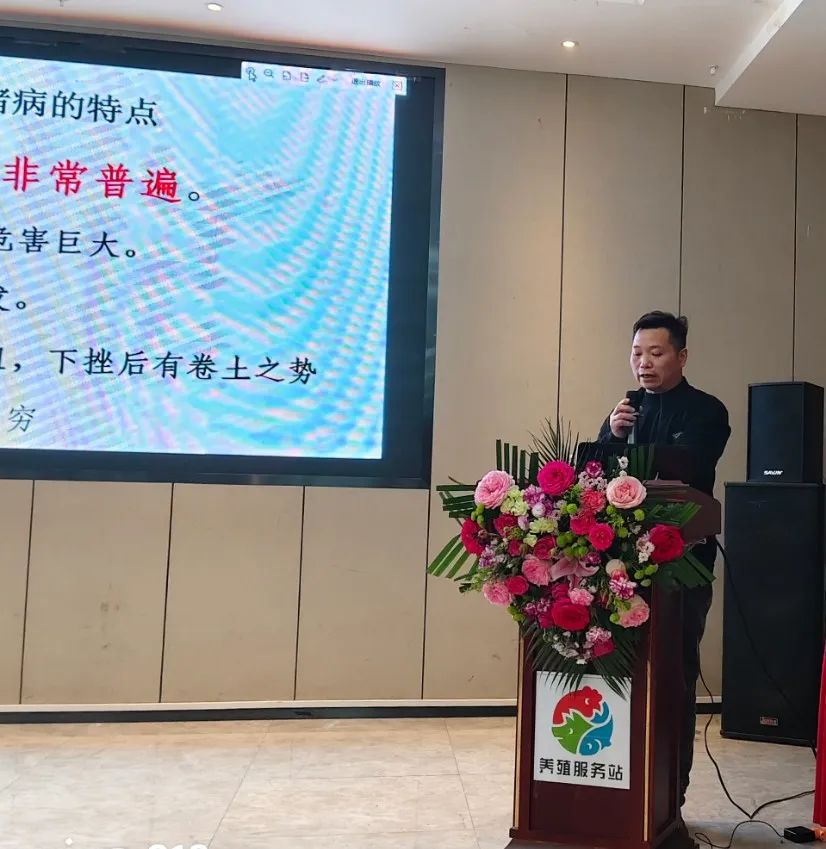 一直堅持秉承健康養殖的理念并竭力為養殖端提高生產效益為目標的胡友軍老師分享了《肉雞飼養管理及中藥的防控與使用》,主要講述以下內容:一是雞的生理特性與缺陷,二是養雞成功的五大條件(品種、飼料、環境、管理、防疫及中藥防控)。胡友軍老師深入講解了健康養殖的關鍵認識是做好中藥對家禽的日常預防保健和生產中的常見疾病防控,比如呼吸道使用強力粵威龍+侯炏凈、腸道使用料磺1號、高山大巴、溫白三;烈性傳染病定期使用正冠樂提高免疫力與抗病毒能力,使用免增粵威龍有助于解除免疫抑制,補氣血等。最后總結了要養好雞必須關注以下幾點:1、做好管理,保障雞群健康;2、總結科學經驗,切忌急亂投醫;3、做好中藥預防,可持續健康養殖。