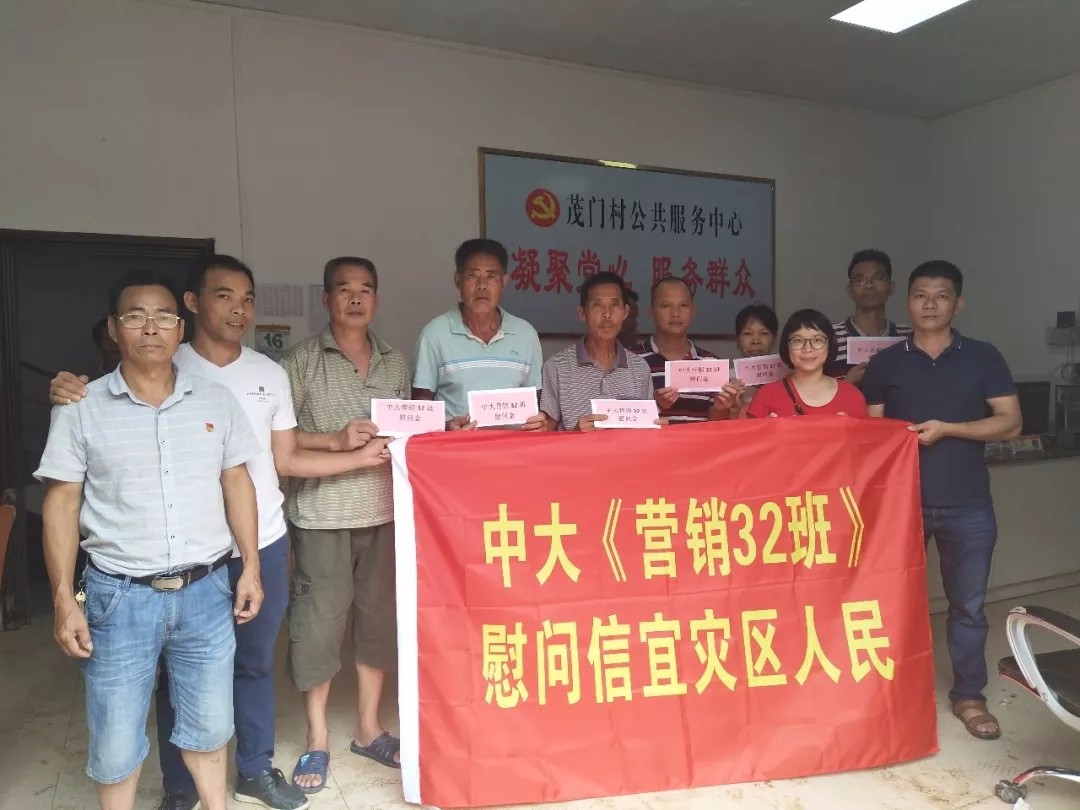 2018年8月17日,高山集團(tuán)常務(wù)副總黎來鳳帶領(lǐng)中山大學(xué)營銷32班同學(xué)慰問團(tuán)代表——高山集團(tuán)鐘飛燕經(jīng)理、黎榮宇經(jīng)理和蔡文清經(jīng)理等驅(qū)車110多公里,親赴重災(zāi)區(qū)新寶鎮(zhèn)茂門村和朝陽村,向全倒戶、重災(zāi)戶、全浸戶共32戶,奉上32班同學(xué)的愛心款項(xiàng),并一一交到救助對(duì)象的手中。