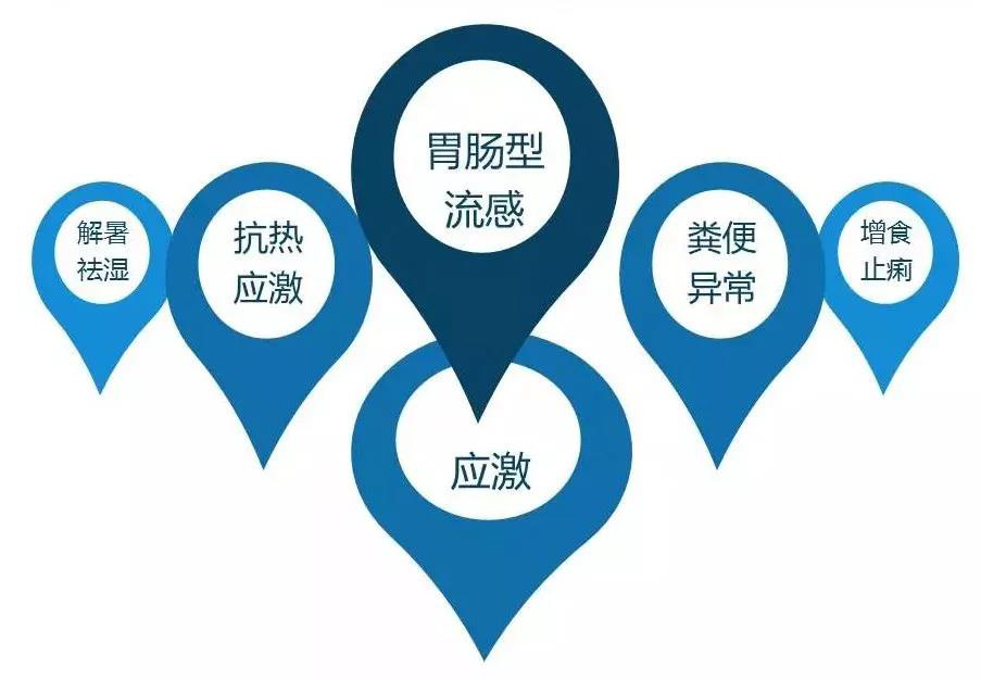 針對畜禽解暑、除濕、增食、止痢、抗應激以及胃腸型流感諸證的定期保健與定期預防等。
