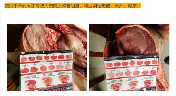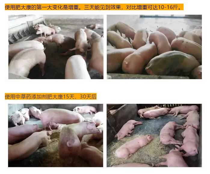 肥大康具有健康、安全和高效等中藥獨特優勢,增重、止痢,尤其是改善肉質效果獨特。從60斤體重起用至出欄,有效改善PSE肉現象,提高屠宰率達80%以上,對比增重可達10~16斤/頭,投入1元可帶來遠遠大于8元以上的額外收益,高性價比,更具有比其他合成類產品無與倫比的品質優勢和傳統中藥獨特的安全優勢,是最新中藥特色應用成果專利技術轉化的產品。