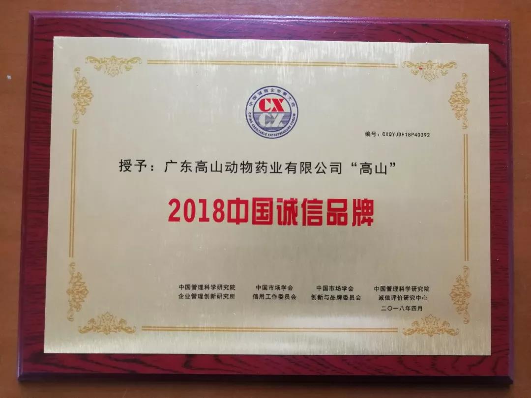 廣東高山動物藥業有限高山品牌被授予“2018中國誠信品牌”稱號。