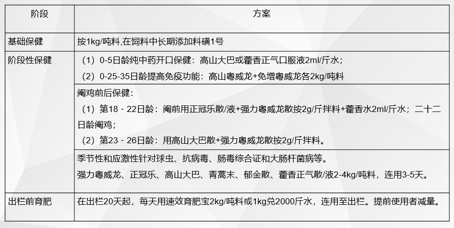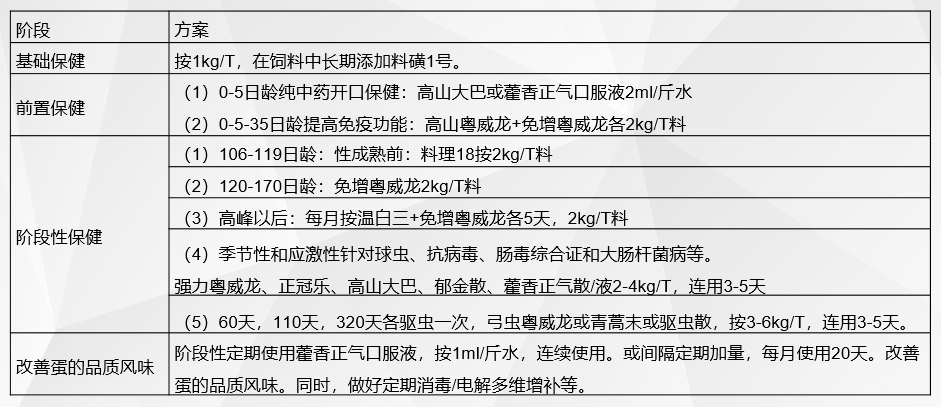 備注: 1、無抗方案成功與否取決于環境、免疫、管理三大基礎是否做到位。 2、預防:根據生理結構的變化和時令給予相對應的措施;天氣變化強力粵威龍2-4公斤/噸料進行預防;暑邪用正冠樂、驅蟲散。 3、輸卵管炎:臨床免增粵威龍+溫白三各2公斤/噸料,每月連用7天,免增粵威龍可以降低破蛋率。 4、蛋鴨無抗方案按上述所有產品的用量增加30%;鴿子的用量和鴨子相同;種用(種雞和種鴨)在產蛋前按上表方案不變,產蛋后用量增加50%。 | ||
