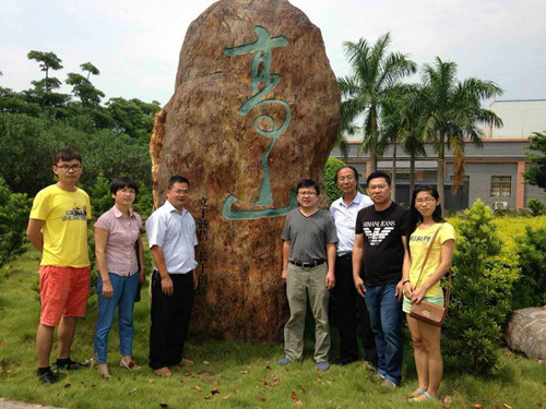 山東省生態與健康產業研究所所長孟祥兵(左四)、廣東海洋大學杜炳旺教授(右三)和公司高層在金方子科技工業園合影