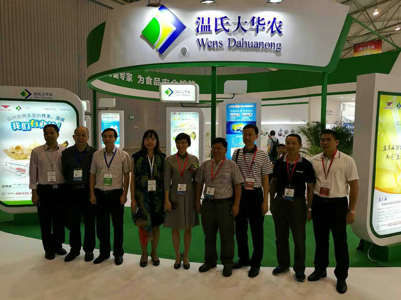 廣東省農業廳畜牧獸醫局鄭洪處長(右四)、廣東省省獸醫飼料質量檢驗所林海丹所長(右三)、溫氏股份副總裁兼大華農事業部總裁陳瑞愛(左五)、溫氏股份大華農事業部副總裁方炳虎(左三)、佛山正典總經理譚志堅(左二)與高山集團梁其佳董事長(左一)合影