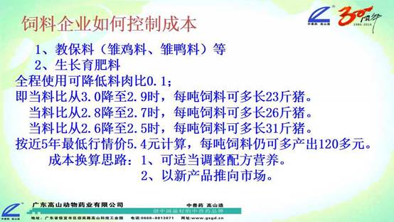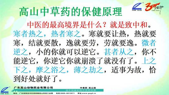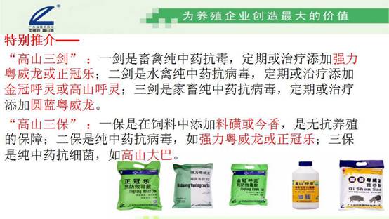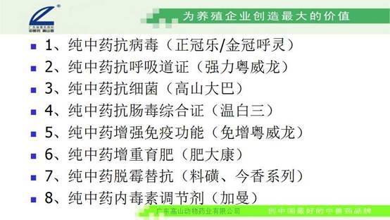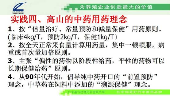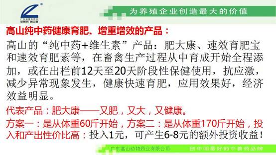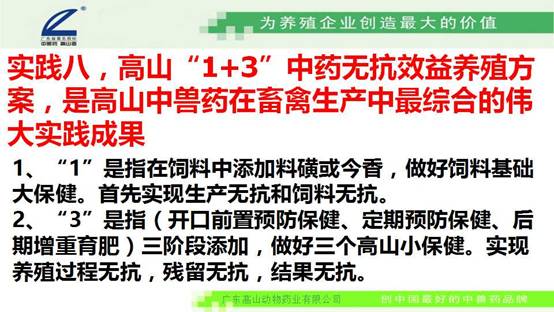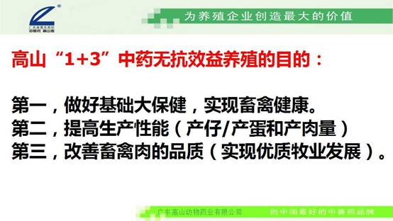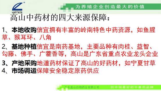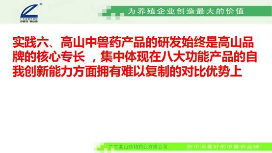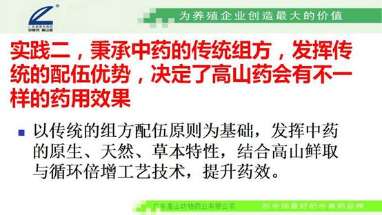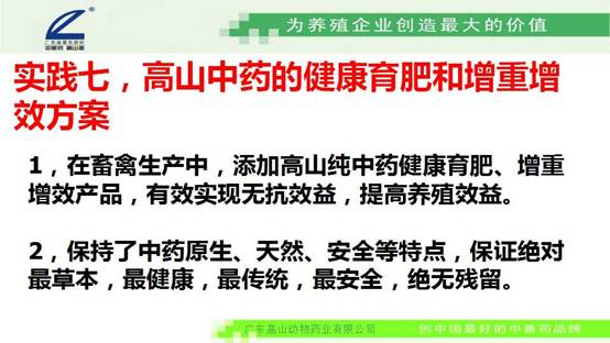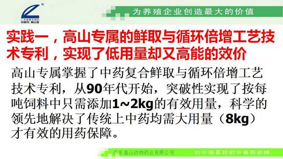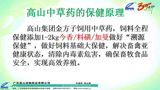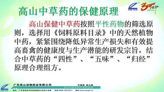 在實現(xiàn)畜禽健康生產(chǎn)的三十年突出實踐中,從純中藥治療,到純中藥預(yù)防,到純中藥保健,解除畜禽亞健康,降低養(yǎng)殖生產(chǎn)成本,實現(xiàn)養(yǎng)殖利潤倍增。高山中獸藥,無論是在臨床治療,還是在飼料基礎(chǔ)功能保健方面,均很好地解決了生產(chǎn)過程中的“效果確切、方案可行和成本可控”等三大基本問題。高山,始終處在創(chuàng)新的前沿!