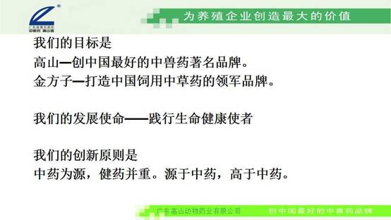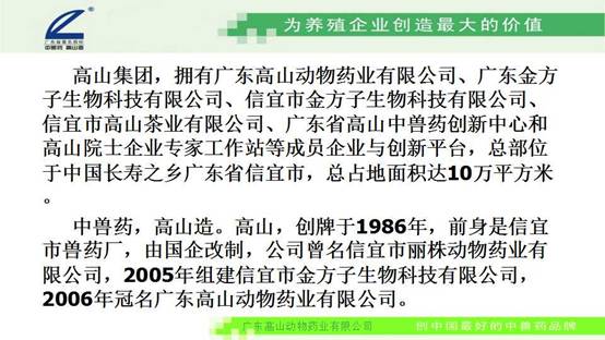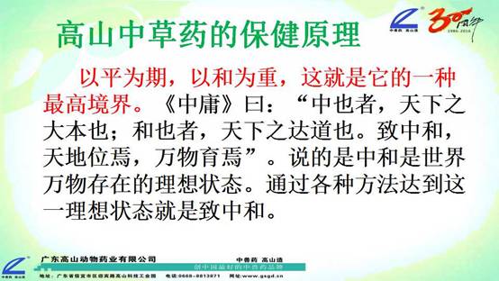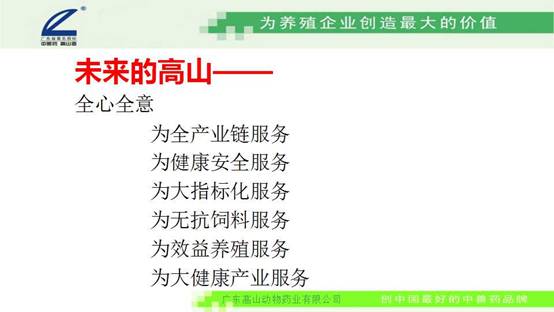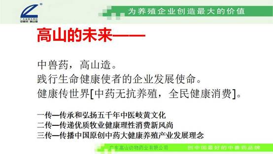 高山,創(chuàng)牌于1986年,一直專注于中獸藥的研發(fā)與應(yīng)用,始終堅持走中獸藥著名品牌的發(fā)展道路。倡導(dǎo)“無抗使用中藥,胡保畜禽健康。保障畜禽健康,實現(xiàn)人類安全”的 “大健康”生態(tài)養(yǎng)殖理念。