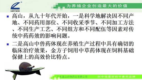 中獸藥,高山造。高山,以確切的臨床治療效果確立高山中獸藥的行業(yè)領(lǐng)先地位。金方子,以高山“1+3”中草藥全程無抗功能保健模式,確立金方子飼用中草藥功能保健的領(lǐng)航角色。