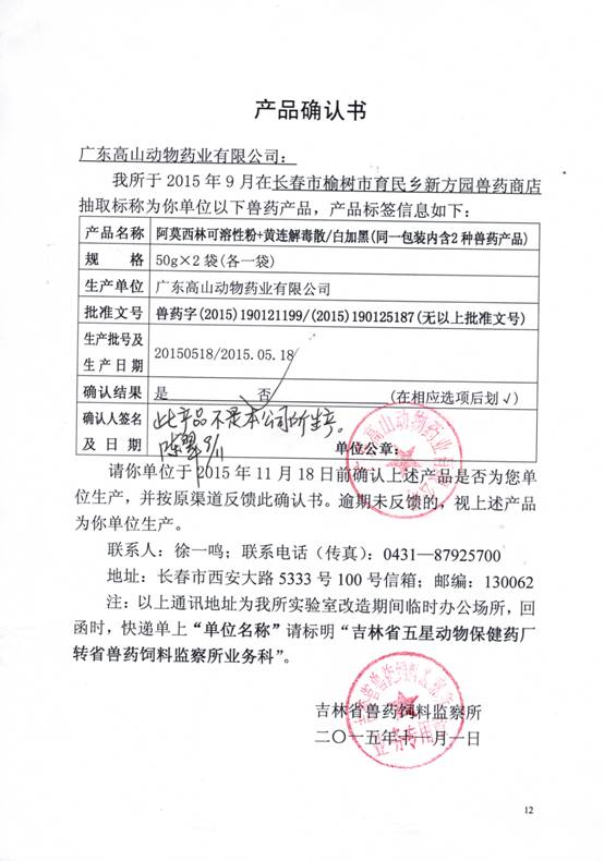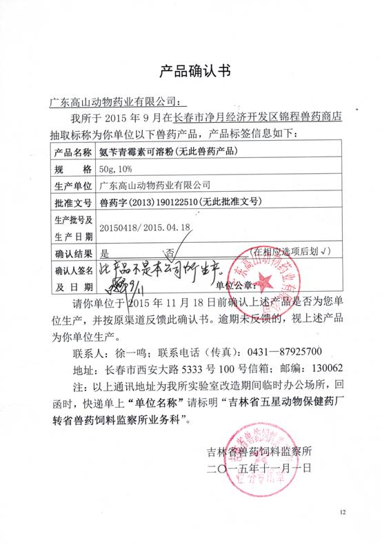 二、近期在吉林省被抽檢的“氨芐青霉素可溶粉(無此獸藥產品)”、“阿莫西林可溶性粉+黃連解毒散/白加黑(同一包裝內含2種獸藥產品)”并非公司生產,該抽檢產品為假冒產品,現向廣大消費者溫馨提示:廣東高山動物藥業有限公司的產品擁有公司專有的、統一的、規范的包裝視覺系統,以及產品代碼和防偽電話系統,公司的業務人員均佩戴有公司的工作證和公司徽章。擁有公司合法的、完整的、正規的銷售渠道和網絡,敬請廣大消費者從公司直管的各省區渠道進貨,并認準廣東高山動物藥業有限公司的產品,謹防上當受騙。廣東高山動物藥業有限公司是高新技術企業、廣東省誠信示范企業、同時擁有兩個廣東省著名商標,接受名牌商標保護。假冒產品是嚴重違反獸藥管理條例和商標保護相關法律法規的違法行為。公司保留對下述假冒產品銷售行為的進一步追究權利。