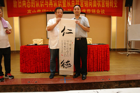 高山中藥、書法、茶道,一起傳承了中華民族文化。會議期間,品嘗高山養生茶,飲享中國養生茶文化,與彭教授、新聘請的高山技術老師顧問團劉詩柱老師、葛君慧老師、李毅老師等行業專家互動交流,還有,中國書法家協會會員、中國書畫名家協會理事、中南海紫光閣書畫院長、北京子書畫院院長吳子書書法家和茂名市神州書畫家協會副主席、信宜分會常務副主席兼秘書長、茂名市信宜文化藝術中心常務副主任彭奕海書法家 一起蒞臨會場,題字“仁德”生輝!并以“民族的,世界的“題字勉勵高山的無抗養殖生命健康事業,在2015年營銷業績同比增長大勢上,再創輝煌。