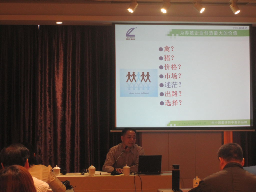 彭教授在會上展示了以甘草瘟毒康顆粒兌水噴霧治療豬牛無名高熱及瘟毒證示范,用“甘草瘟毒康顆粒+圓藍粵威龍”、“定喘散+圓藍粵威龍”和“泰山盤石散等產品做好種豬三保健”,以三套車喻行做好大家畜市場的營銷工作。