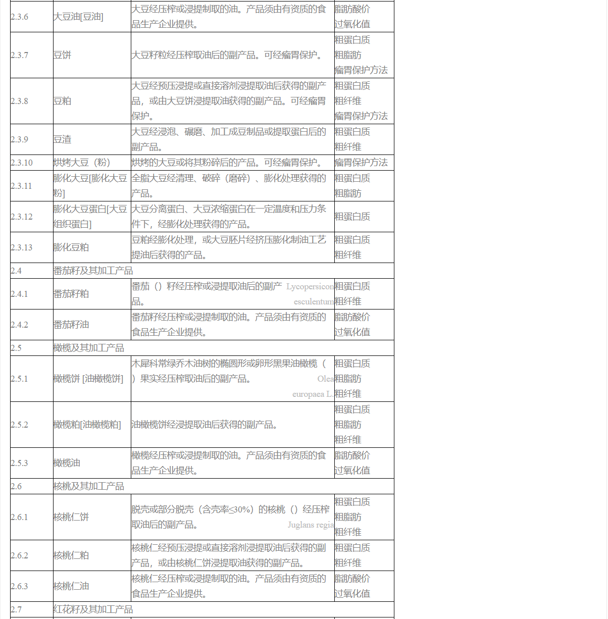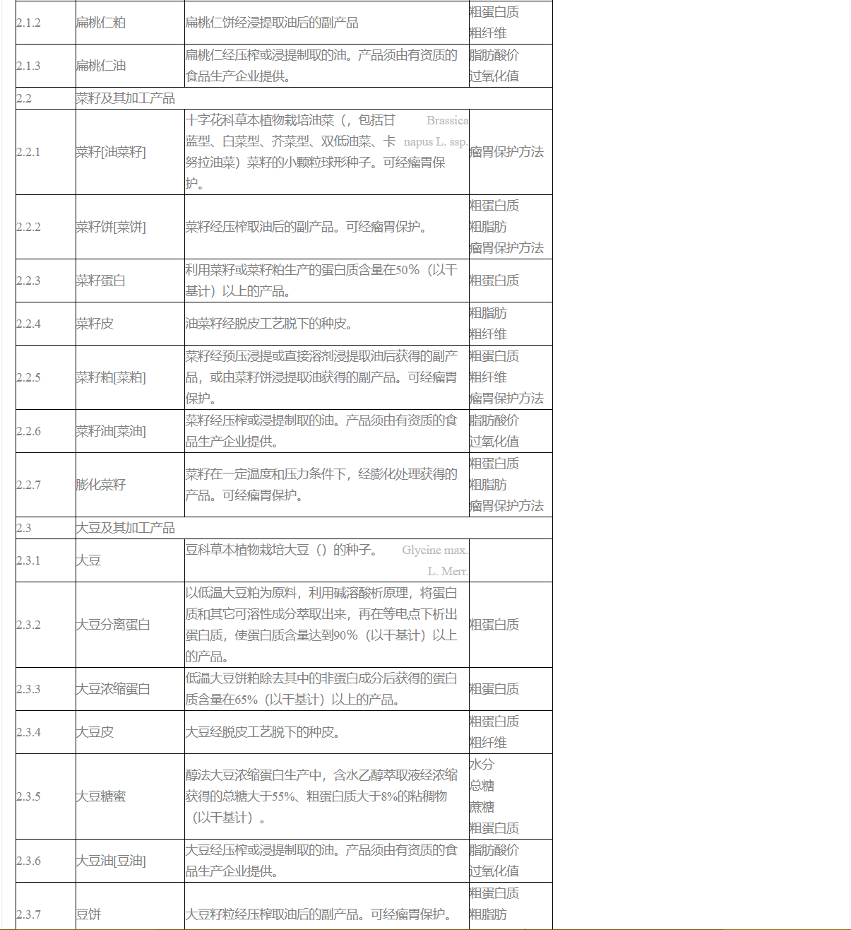 2. 菜籽粕、菜籽蛋白、大豆糖蜜、大豆分離蛋白、大豆濃縮蛋白、豆粕、膨化豆粕、膨化大豆蛋白[大豆組織蛋白]、花生粕[花生仁粕]、花生蛋白、棉籽粕、棉籽蛋白