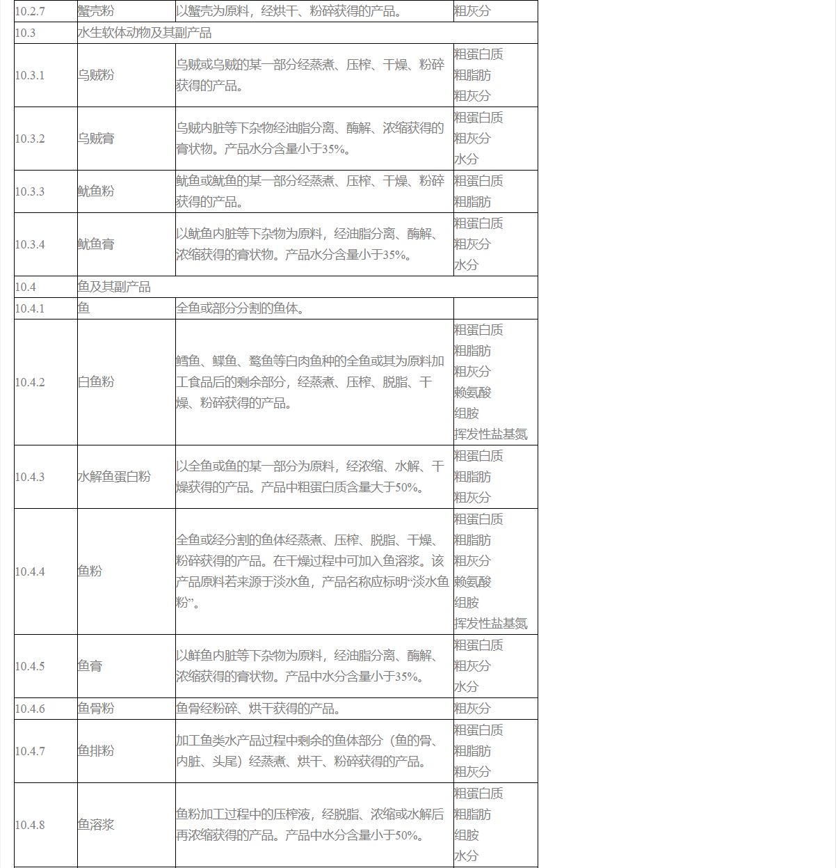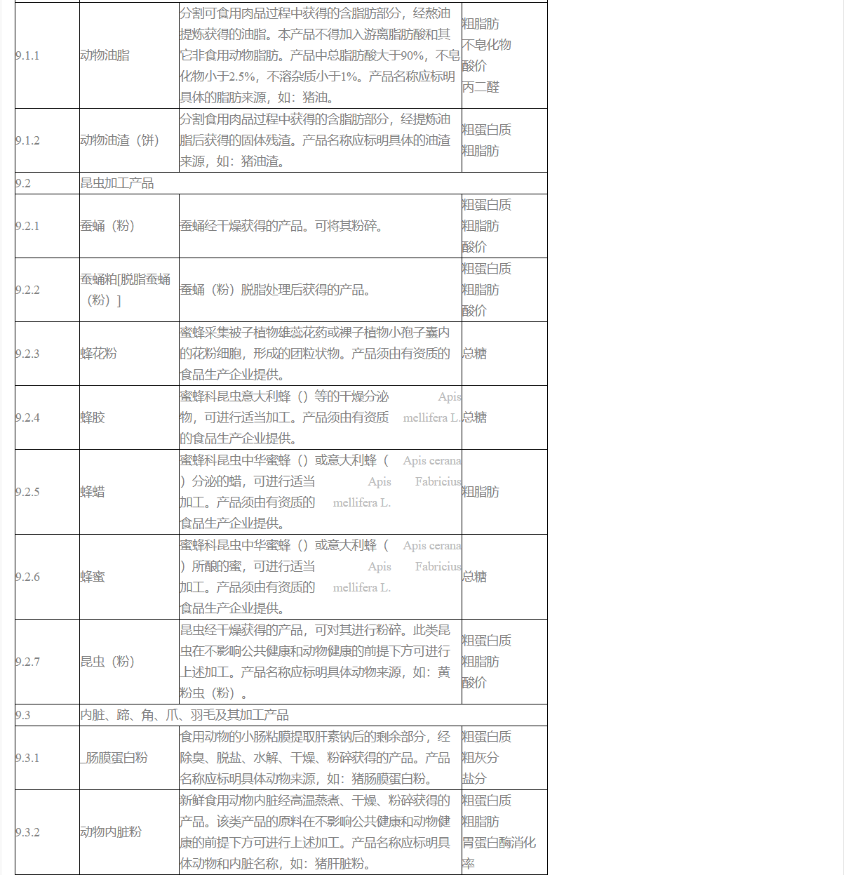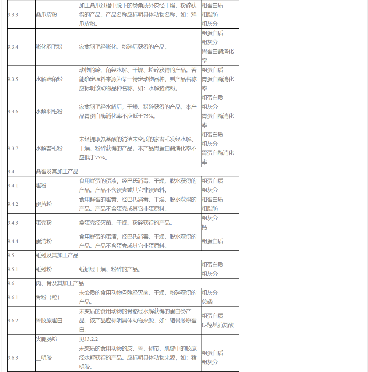 4. 肉粉、肉骨粉、骨粉(粒)、酸化骨粉、脫膠骨粉、明膠、骨膠原蛋白、動物內臟粉、禽爪皮粉、水解蹄角粉、腸膜蛋白粉、膨化羽毛粉、水解羽毛粉、水解畜毛粉、血粉、水解血粉、噴霧干燥血漿蛋白粉、噴霧干燥血球蛋白粉、水解血球蛋白粉、水解珠蛋白粉、血紅素蛋白粉、蛋粉、蛋黃粉、蛋清粉、蛋殼粉、動物油脂、動物油渣(粉)、