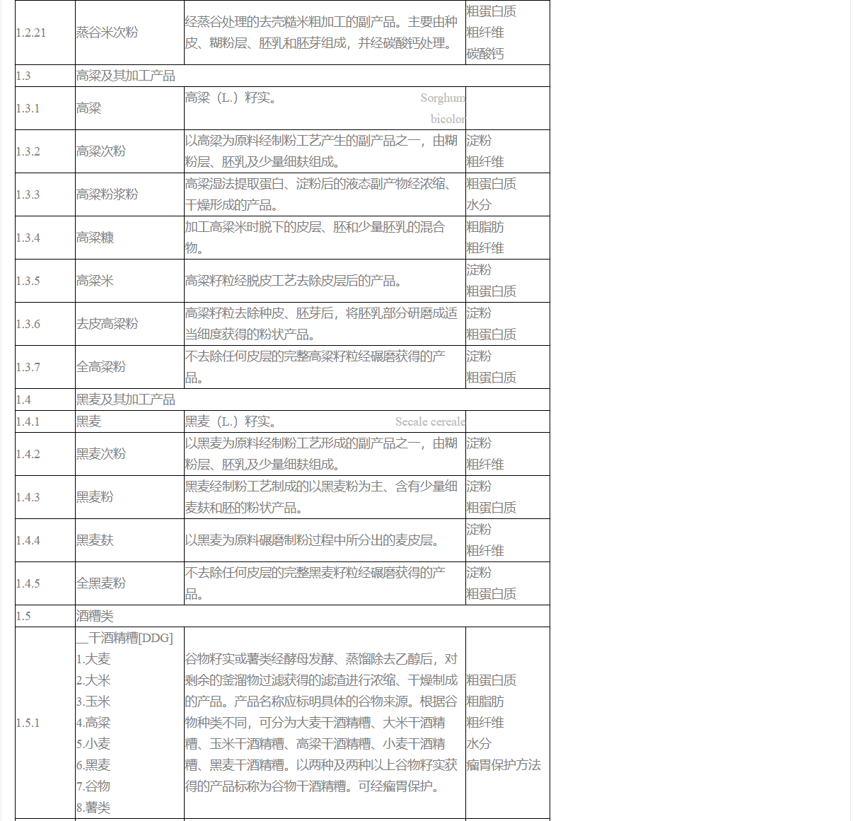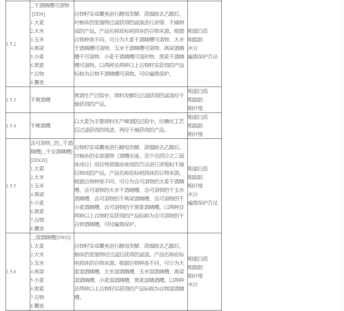 1. 大麥蛋白粉、大米蛋白粉、玉米蛋白粉、谷朊粉[小麥蛋白粉、活性小麥面筋粉]、干酒精糟[DDG]、干全酒精糟[DDGS]、干酒精糟可溶物[DDS]、干啤酒糟、干黃酒糟