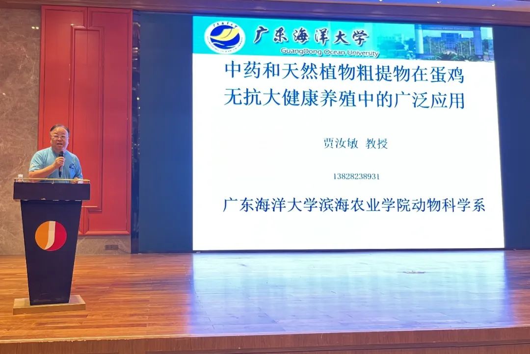 廣東省水禽產業(yè)技術體系崗位專家、廣東省農村科技特派員、廣東海洋大學濱海農業(yè)學院動物科學系賈汝敏教授作《中藥和天然植物粗提物在蛋雞無抗大健康養(yǎng)殖中的廣泛應用》報告,首先分享了蛋雞全程中藥替抗技術試驗,試驗結果表明在規(guī)模化蛋雞場采用純中藥替抗技術生產無抗雞蛋是可行的,試驗數據顯示90%以上的產蛋率可持續(xù)達到13個月。其次講解蛋雞高產綜合配套技術和其它家禽的中藥保健方案,最后分享了近期鵝病新動向,一是東北鵝流感可以用正冠樂8克+安黃舒8克+高山大巴4克,拌1斤料;二是南方鵝副黏可以用金冠高山4克+今香健1克+高山大巴2克,拌1斤料。