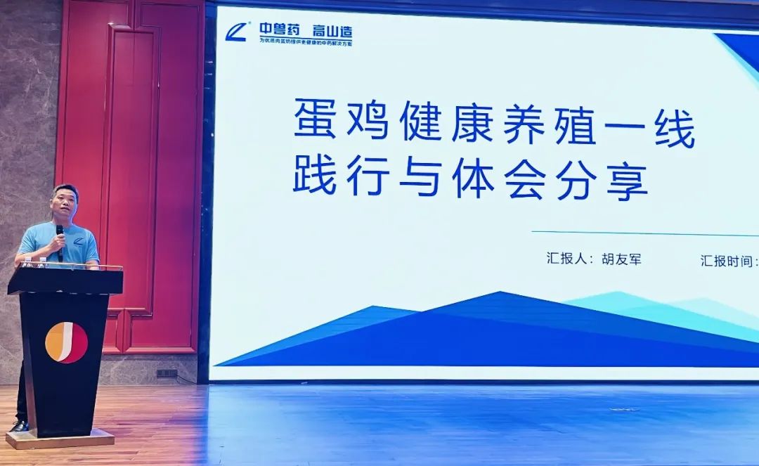 畢業(yè)于牧業(yè)經濟學院,具有中國人民大學農牧MBA學位的胡友軍老師作《蛋雞健康養(yǎng)殖一線踐行與體會分享》,首先分享了時刻保持系統的養(yǎng)殖思維、準確抓住蛋雞的生理節(jié)點、關注蛋雞的全程產蛋性能與蛋品質和關注蛋雞養(yǎng)殖端的幾個細節(jié)的寶貴經驗,特別是高山產品的使用效果如排解內毒素用“料磺1號”、雛雞開口保健用“金方15溶液+免增粵威龍口服液”、抗病毒用“正冠樂”、鼻炎用“鼻原康”、白冠病用“青蒿末”、呼吸道用“強力粵威龍”。