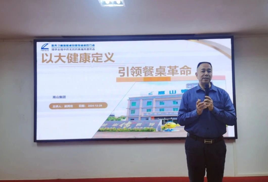 廣東省人大代表、華南農業大學學位研究生第二導師、華南理工大學食品科學與工程學院工程碩士研究生校外指導教師、廣東海洋大學客座教授、高山商學院院長、高山集團董事長梁其佳作了《以大健康定義 引領餐桌革命》的主題報告,他從當前產業業態的發展趨勢及當前的“卷”說起,深度闡述了中獸醫藥的高山定義及其業態擔當,要將中藥的疾病預防與中藥的功能保健相結合應用于畜禽生產中,以高山“3+1”措施,助力全過程中藥無抗健康養殖,其目的是生產出更安全、更健康、更優質和更美味的肉蛋奶品!消費在降級,而健康在升級,服務于5%的高端餐桌人群,引領健康消費與產業向新發展。他指出,高山2025年營銷工作重點是抓住1個中心:高舉全過程無抗養殖;2個抓手:一是實施“三個1工程”,做好據點市場,在市場、客戶和產品結構布局中拾缺補短,精耕細作,擠占份額;二是以示范基地和示范場為抓手,引領高山品牌向新向優向全產業鏈服務延伸。他勉勵我們,認準并堅定致力于成為服務高端餐桌的倡導者和踐行者!為餐桌提供全過程中藥無抗的高端肉蛋奶品!堅定地在中藥全過程無抗健康養殖的發展道路上繼續前進!