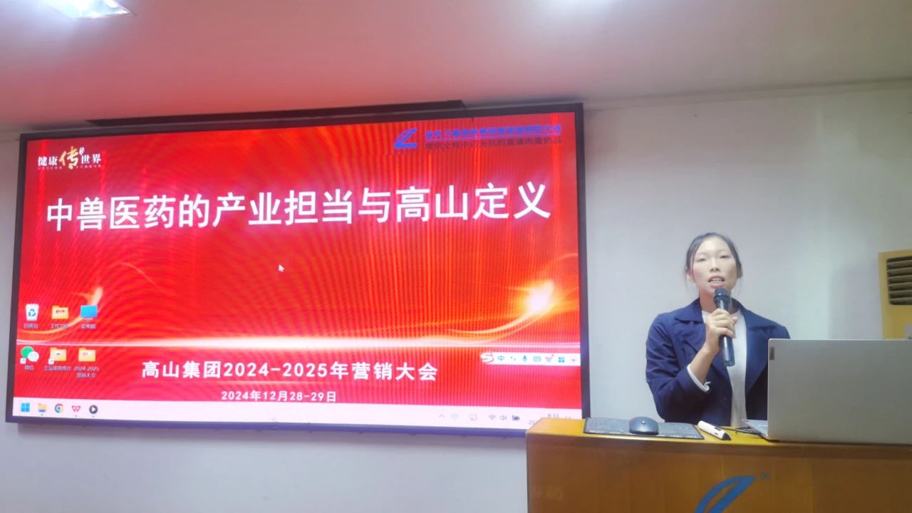 2024年12月28-29日,《高山集團2024-2025年度營銷大會》在高山總部召開。大會以“中獸醫藥的產業擔當與高山定義”為主題。來自全國三十多個省區營銷精英、客戶嘉賓和公司高管等70多人參加,總結2024 年營銷工作,共謀破局向新發展,共繪2025營銷大健康藍圖!大會由營銷中心副總監龍美秀和商學院培訓師鐘飛燕主持。