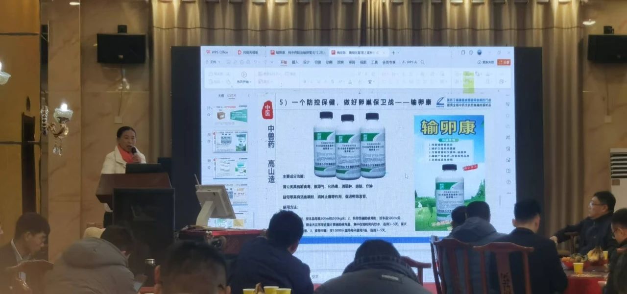 高山形象店店長及資深技術老師王秀華作《高山八大功能產品及經典方案分享》報告,主要分享大病毒、大呼喘、大霍亂、大腸道、大毒素、大應激和大原蟲等功能產品的使用心得,特別是心包和積液證,并發非典型霍亂時用正冠樂+高山大巴+料磺1號,提高產蛋脈沖式用料磺5912,種禽產前保健用料理18。特別分享了輸卵康在湖南、江西、山東、四川等地的應用案例,輸卵康在生產中使用可應對蛋禽輸卵管炎問題和蛋品的藥殘問題,有助于提高產蛋和改善蛋品質,并推薦在產蛋率5%時、50%時、90%以及在高峰期每月定期使用做好預防,聯合料磺5912效果更佳。