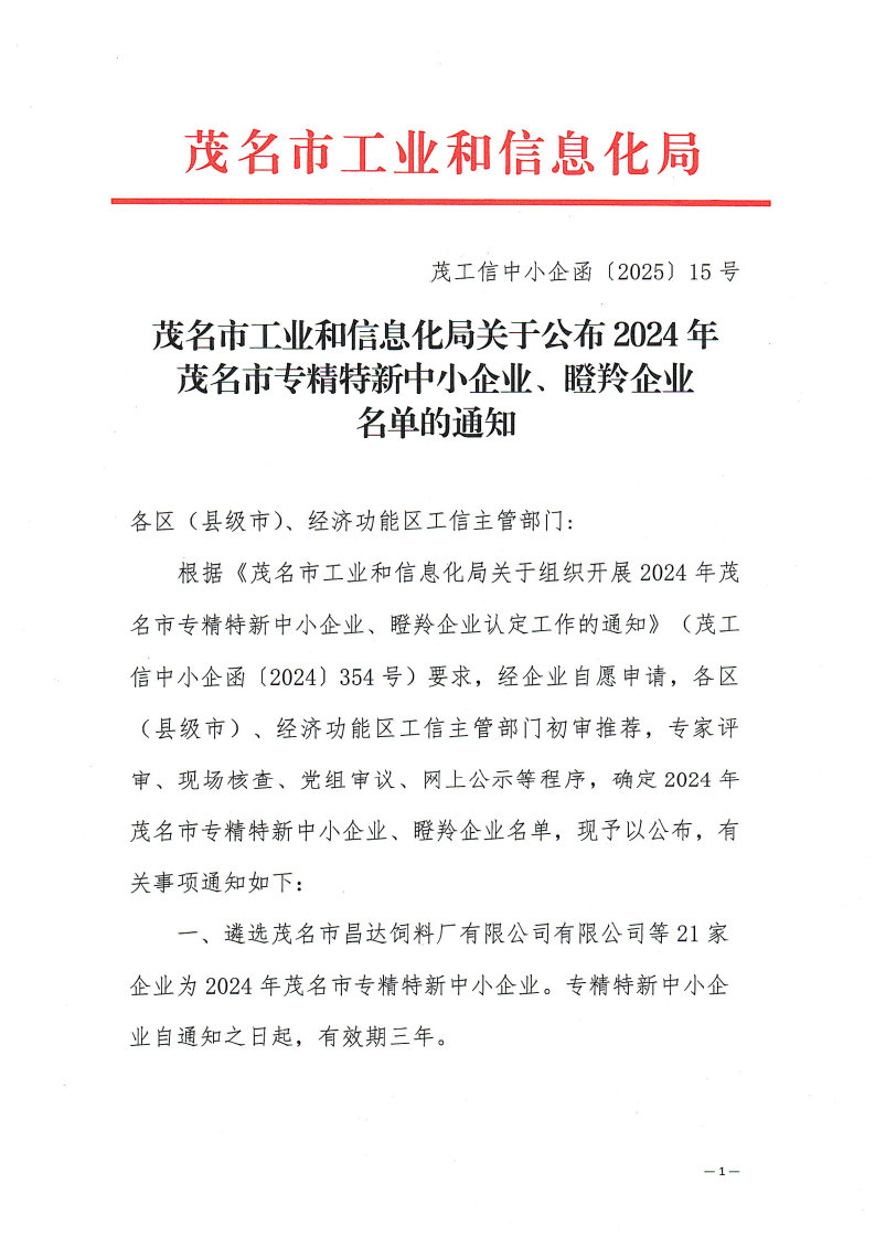 熱烈祝賀高山集團骨干成員企業廣東高山動物藥業有限公司和信宜市金方子生物科技有限公司于2025年2月被評為2024年茂名市專精特新中小企業榮譽稱號。