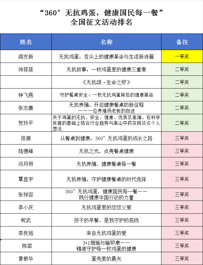 這次征文活動的成功舉辦,不僅為寫作愛好者搭建起才華綻放的舞臺,更使“360°無抗雞蛋,健康國民每一餐”的理念深入人心。每一篇獲獎佳作都如同一顆希望的種子,在讀者心中種下對全過程無抗健康養殖的認知與追求。我們相信,通過這樣的活動,會有越來越多的人關注無抗養殖,選擇無抗食品,讓無抗食品真正成為國民餐桌上的健康之選,助力健康中國建設邁向新的臺階。