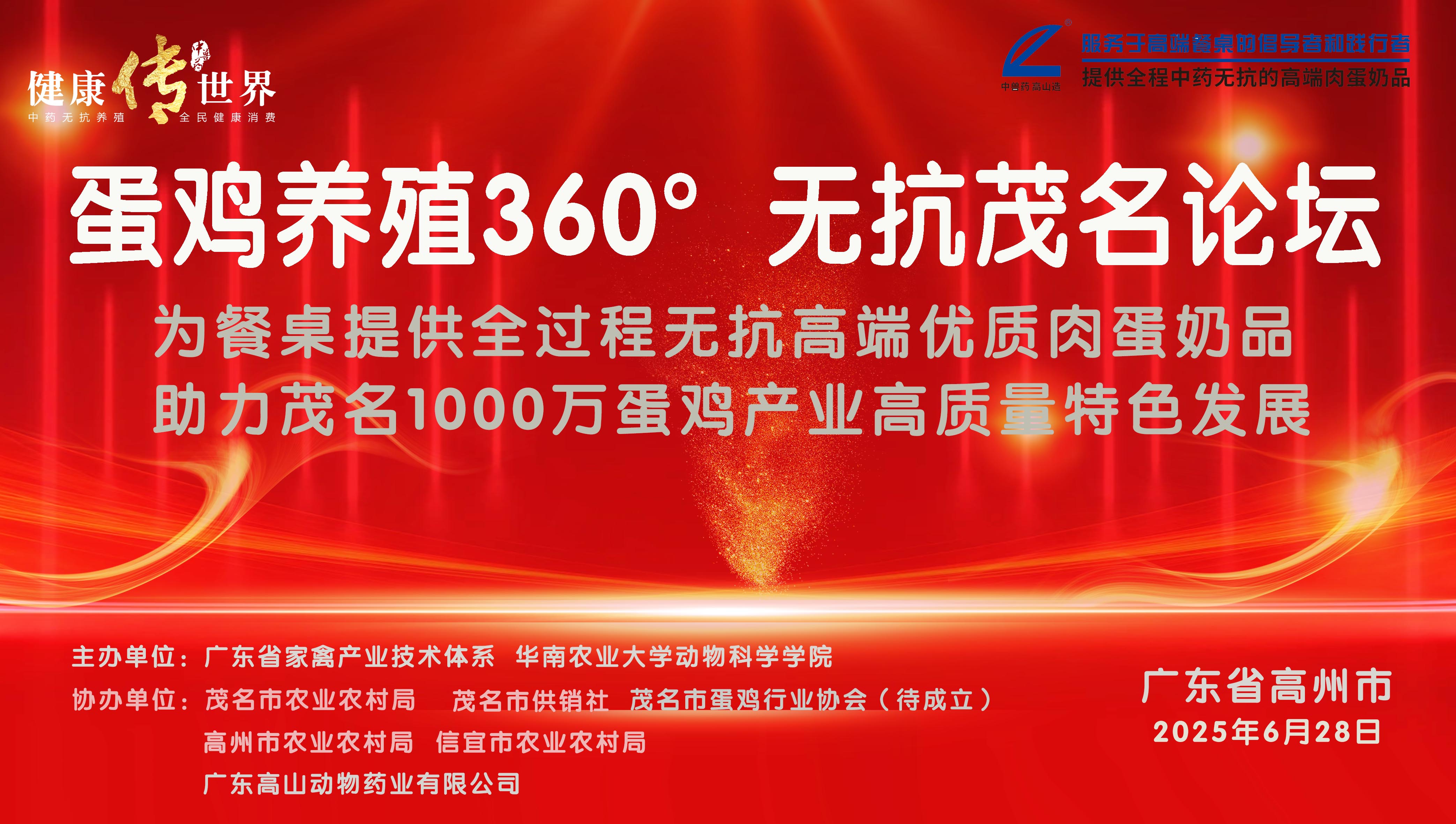 廣東高山動物藥業有限公司誠摯邀請您來參加,2025年6月28日在廣東省高州市舉辦的《蛋雞養殖360°無抗茂名論壇》!