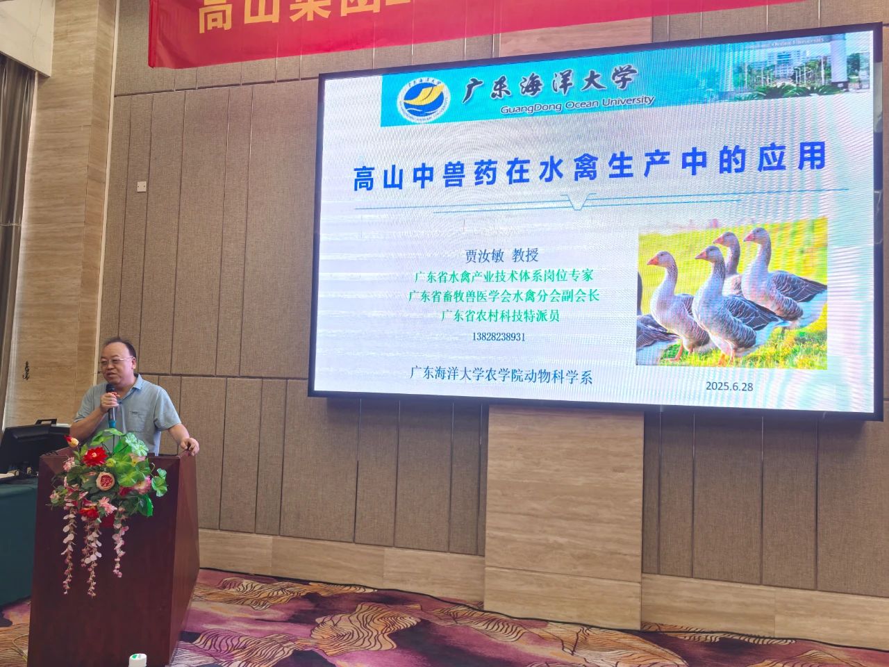 廣東省水禽產業技術體系崗位專家、廣東省農村科技特派員、廣東海洋大學濱海農業學院動物科學系賈汝敏教授作《高山中藥在水離生產中的應用》報告,首先講解當前水禽呈現多種病毒混感、病毒與細菌混感的流行特點,同時剖析水禽的常見疾病,同時指出,水禽近期病毒性疾病呈現出多發趨勢,并從呼腸孤病毒病、禽流感、副黏病毒病、安卡拉病和水禽痛風的發病特點和主要癥狀作了詳細的分析,并要從“養、防、檢、治”做好防控,特別是使用中藥做好定期預防,例如呼腸孤病毒病用加曼六康,禽流感用正冠樂、免增粵威龍和雙黃連散,副黏病毒病用正冠樂、黃芪多糖口服液和雙黃連口服液,安卡拉病用心型正冠樂和免增粵威龍散,水禽痛風用風道液和安黃舒等。最后分享暑熱應激下水禽養殖存在的問題及對策建議,可以從減少熱應激、飼料營養、水質、清除內毒素、合理光照和提高孵化率的措施等改善夏季種鵝繁殖性能,特別是使用中藥預防,暑熱應激用藿香正氣口服液、增強免疫用免增粵威龍散、腸道健康用白頭翁散和溫白三、排毒解毒用料磺1號、抗病毒用正冠樂、雙黃連口服液和黃芪多糖口服液等。