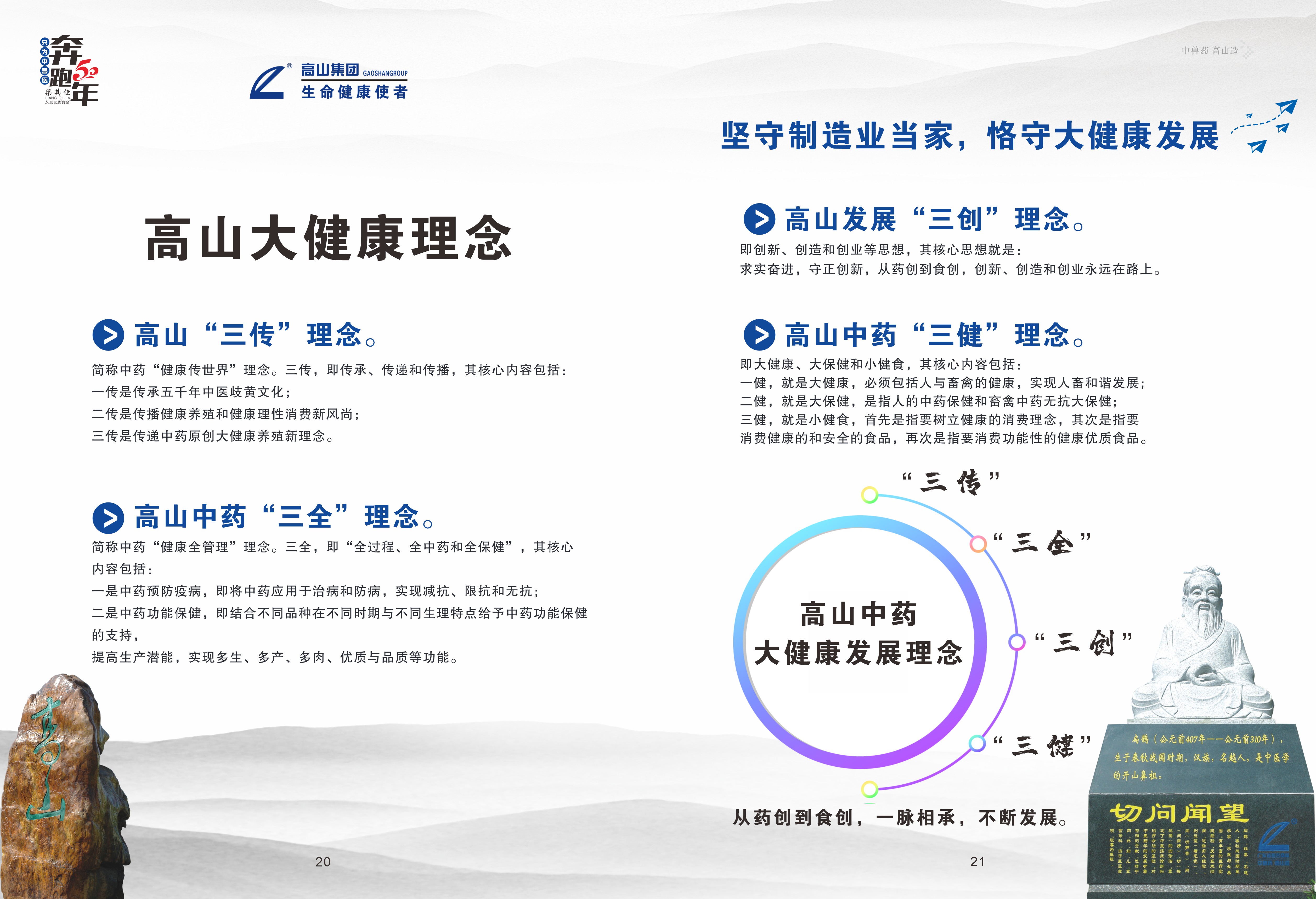 高山,始終如一堅守中藥無抗大健康養殖的發展理念,以踐行生命健康使者作為企業的發展使命,從“健康傳世界”(簡稱“三傳”理念),到“健康全管理”(簡稱“三全”理念),到“創新、創造和創業”(簡稱“三創”理念),到“大健康、大保健和小健食”(簡稱“三健”理念),為優質肉蛋奶提供更健康的中藥解決方案,從藥創到食創,一脈相承,不斷發展。