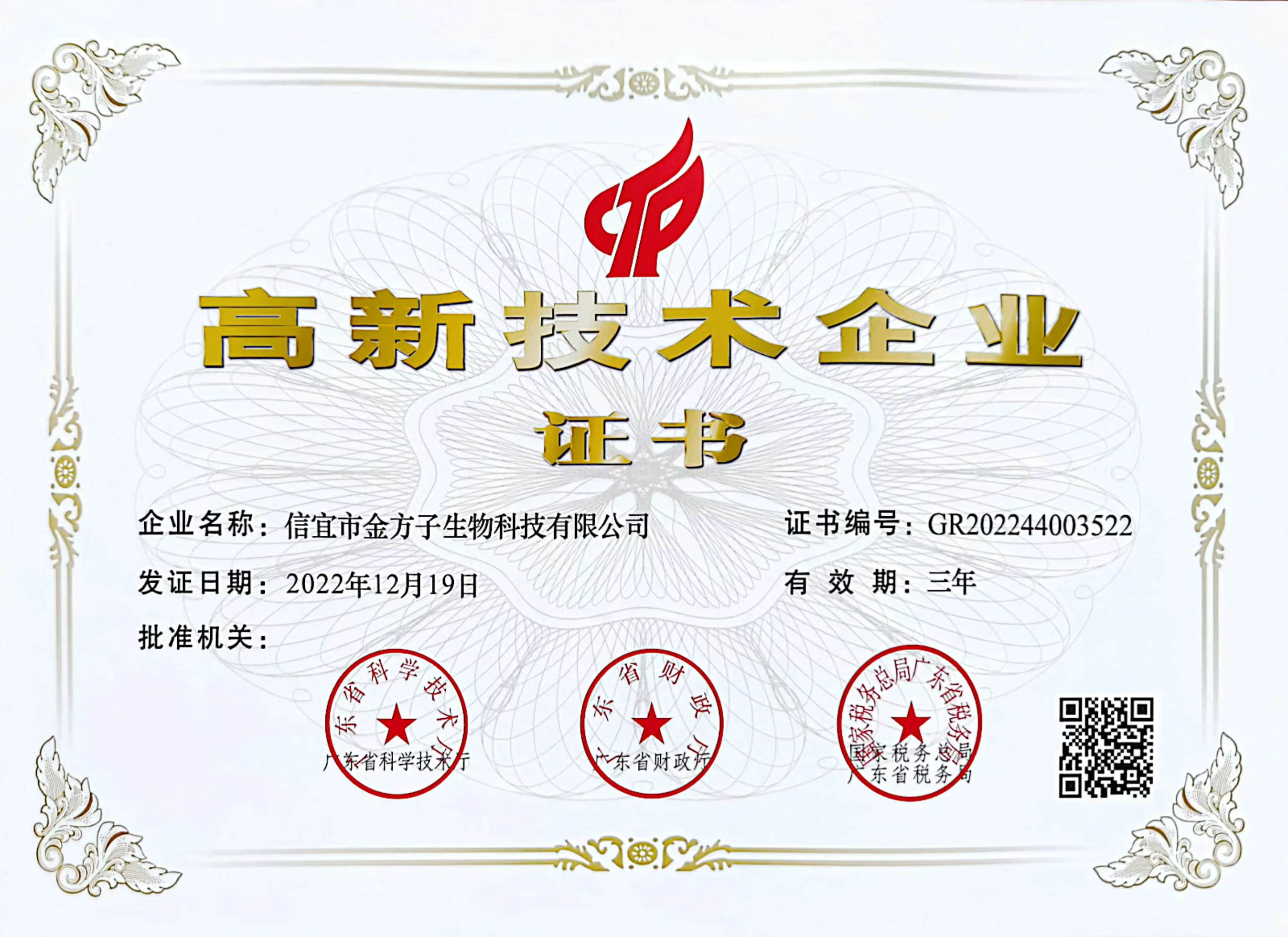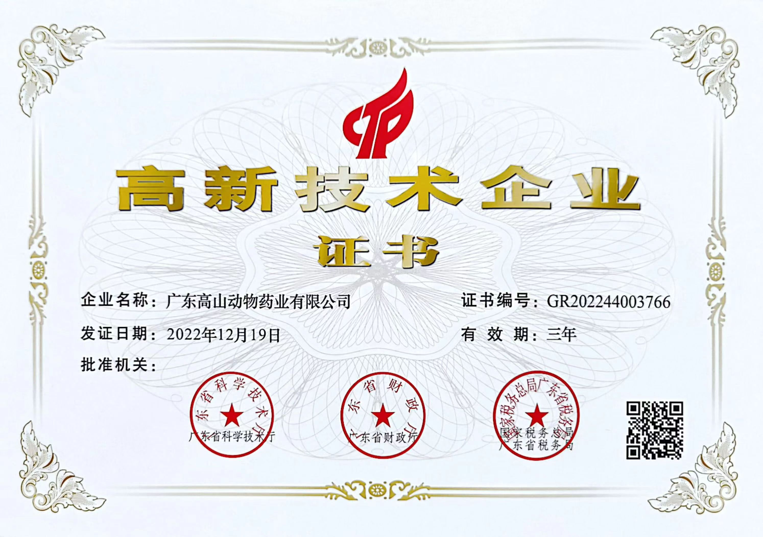 熱烈祝賀高山集團骨干成員企業廣東高山動物藥業有限公司和信宜市金方子生物科技有限公司于2022年12月獲得國家高新技術企業認定,并于近日獲頒證書及授牌。
