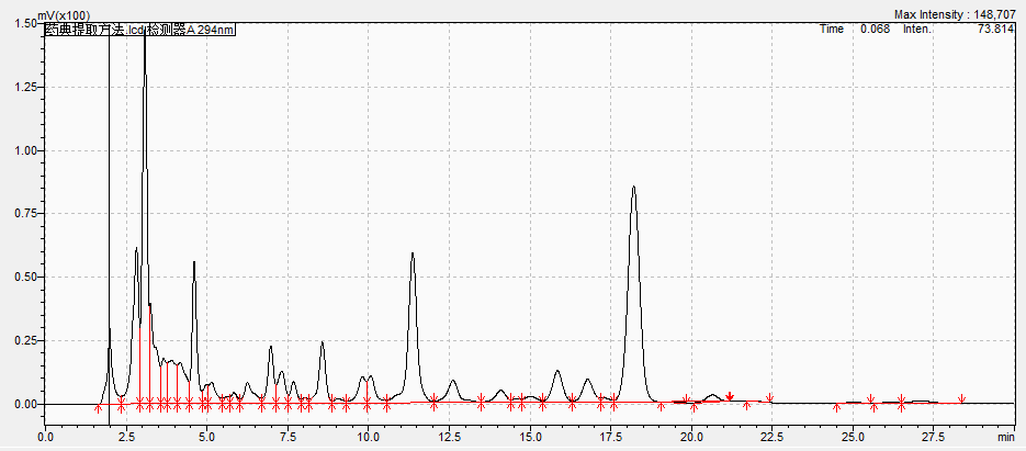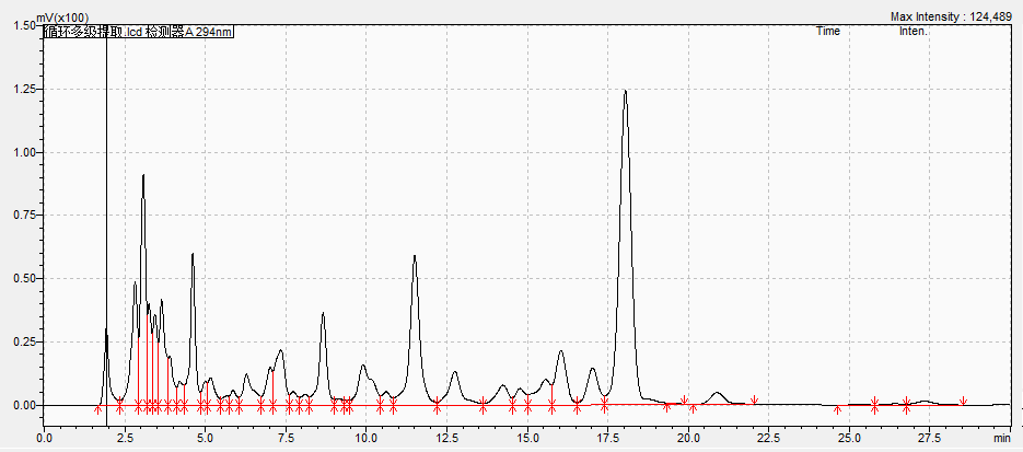 藿香正氣口服液依據(jù)《中國(guó)獸藥典》2015年版二部生產(chǎn),配方中含有厚樸,在其建議生產(chǎn)工藝中厚樸的提取方法是采用60%乙醇加熱回流1小時(shí)。經(jīng)研究總結(jié),廣東高山技術(shù)創(chuàng)新中心對(duì)厚樸提取工藝采取多級(jí)循環(huán)蒸餾提取,以及醇和水提結(jié)合,能充分將其有效成分和有用成份提取出來(lái),所得的有效成分比原標(biāo)準(zhǔn)工藝多,而且有效成分含量高(見(jiàn)附圖1、附圖2液相色譜圖),有用成份膏體更多,產(chǎn)品的臨床效果比原生產(chǎn)工藝更好。“道地(藥材產(chǎn)地)+鮮取(藿香)+厚樸提取工藝改進(jìn)”,致其所制得的藿香正氣口服液的效果也更好更獨(dú)特。