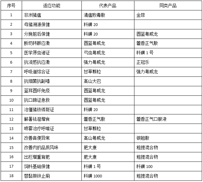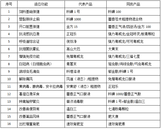 在畜禽生產(chǎn)中,由強致病性微生物,如細菌、病毒引起的傳染病,對生產(chǎn)帶來的異常問題越來越普遍,包括病毒性傳染病和細菌性傳染病。從中醫(yī)角度講,凡是急、猛、快的傳染病證都可以歸結(jié)為瘟證。瘟證,容易出現(xiàn)在畜禽生長的各個階段,如開口、育雛、產(chǎn)蛋、轉(zhuǎn)群、分娩、育成、育肥等,也容易出現(xiàn)在一年四季的各個時間,尤其是病毒性瘟毒邪疫證,已從過去只在冬春多發(fā)向一年四季常發(fā)轉(zhuǎn)化。瘟證,對畜禽健康養(yǎng)殖影響極大,若解決不好瘟證問題,就不能很好的解除在臨床中出現(xiàn)的生產(chǎn)異常問題和亞健康問題。由于環(huán)保和食品安全的要求,臨床中解決瘟證問題,既要效果確切,更要綠色、安全、無殘留。既要防,也要治,更需要定期凈化。中國傳統(tǒng)中醫(yī)中藥應(yīng)用于針對畜禽瘟證問題,不僅可以治療,還可以預(yù)防,更可以保健,尤其是對提高畜禽機體自身的非特異性免疫功能,解除畜禽亞健康,提高機體對病原體的防御抵抗能力,改善肉質(zhì),提高生產(chǎn)性能。高山,創(chuàng)牌于1986年,從90年代開始,按2-4kg/噸飼料添加,堅持以純中藥應(yīng)對畜禽瘟毒邪疫諸證,已經(jīng)成為高山純中藥的特色對比優(yōu)勢,從保健到預(yù)防到治療,從產(chǎn)品到產(chǎn)品組合到無抗健康方案,積累了豐富的實踐經(jīng)驗,形成了成熟的系統(tǒng)方案。如強力粵威龍應(yīng)對溫和型流感及呼吸道綜合證,正冠樂應(yīng)對瘟疫邪毒所致諸證,針對蛋雞、家禽、家畜等的高山“1+3+1”無抗健康養(yǎng)殖方案等。一、一個天然中藥產(chǎn)品是一個證候的方案。高山中藥的用藥原則:低量保健(1kg/噸料);常量預(yù)防(2kg/噸料);倍量治療(4-8kg/噸料)。病重或首日加量治療時,單個產(chǎn)品或組合多個以上產(chǎn)品的總添加量按10±2kg/噸料。1、家禽:一個高山中藥產(chǎn)品是一個證候方案