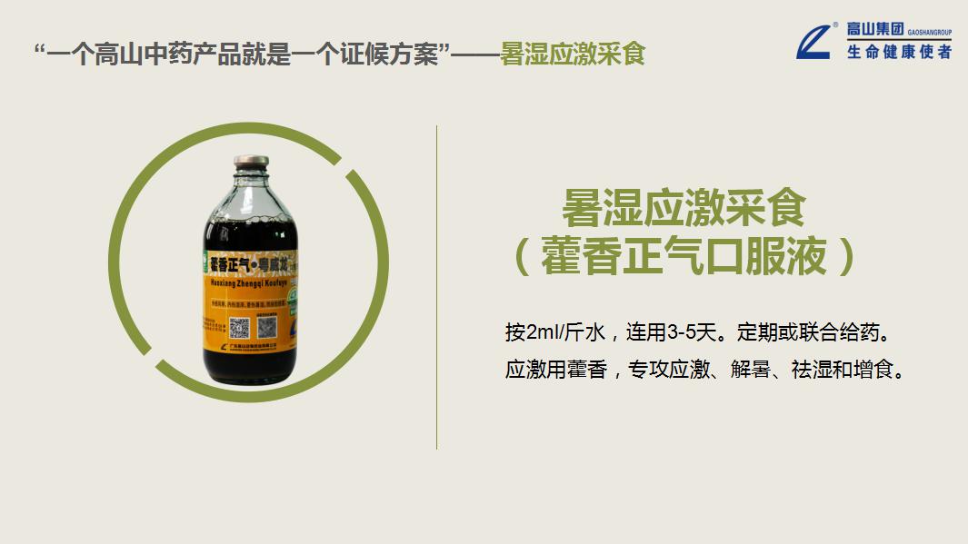 針對(duì)畜禽的暑熱應(yīng)激等所引起的各種證侯問題,優(yōu)選高山藿香正氣口服液/散。高山藿香正氣液/散中的藿香性味辛溫,入脾、胃、肺經(jīng),可化濕健脾,止嘔,發(fā)表。適用于脾濕內(nèi)阻,運(yùn)化失常所導(dǎo)致的脘腹痞滿,食欲不振,惡心嘔吐和身體倦怠等之證等進(jìn)行預(yù)防與治療。高山藿香正氣組方采用本地南藥鮮廣藿香,鮮紅紫蘇葉等傳統(tǒng),優(yōu)質(zhì),道地藥材,經(jīng)復(fù)合鮮取與循環(huán)倍增工藝,通過中藥材鮮取,中藥蒸餾鮮液、蒸餾揮發(fā)油、中藥蒸餾水提液一起濃縮而成,具有比西藥無與倫比的對(duì)比優(yōu)勢(shì)。可幫助解暑,祛濕,止痢,消滯,恢復(fù)采食量,促進(jìn)消化吸收,促進(jìn)生長(zhǎng)發(fā)育,不影響生產(chǎn)性能。