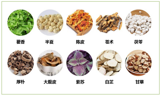 藿香正氣散是為外感風(fēng)寒,內(nèi)傷濕滯之霍亂吐瀉而設(shè)。方中重用藿香辛溫芳香,外解表邪,內(nèi)化濕濁,理氣和中,辟穢止嘔,為君藥。紫蘇、白芷助君藥解表散寒,且有芳香化濕之功;半夏曲、陳皮燥濕祛痰,和胃降逆;厚樸、大腹皮化濕散滿,下氣寬中,使氣行則濕濁易去,以上均為臣藥。濕滯之成,由于脾不健運,故又以白術(shù)、茯苓健脾化濕;桔梗宣肺利膈,以通調(diào)水道,排除濕邪,均為佐藥。炙甘草益氣健脾,調(diào)和諸藥;生姜、大棗益胃和中,共為使藥。
