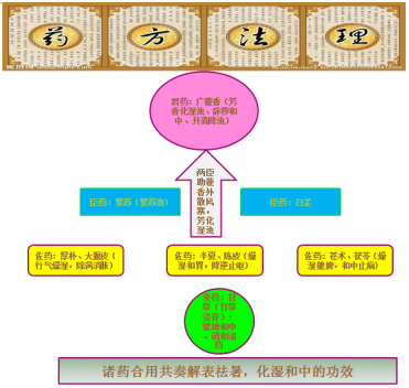 全方配伍,有解表化濕,理氣和中,各藥合用,使風寒得解而寒熱除,內濕得化則消滯阻,氣機通暢則胸膈舒,脾胃調和則止瀉吐。