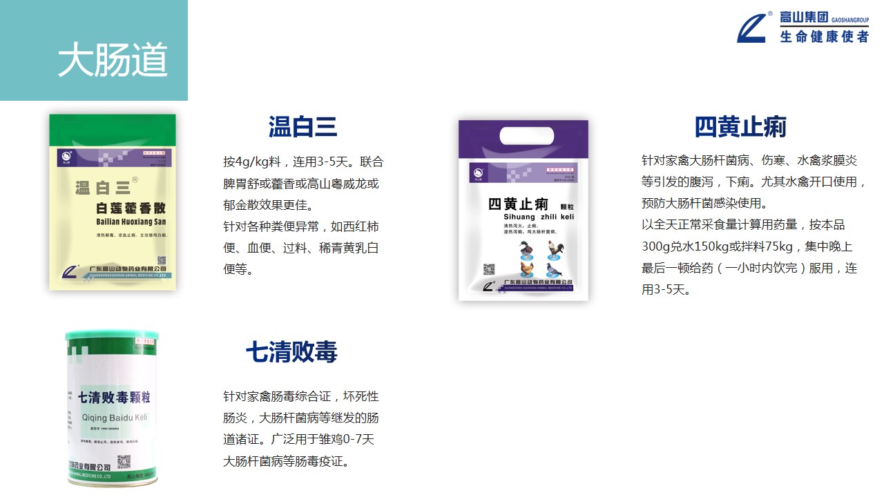 前言:在畜禽生產中,病毒已普遍存在,或兩種,或三種,或更多。而且,因為病毒不斷變異,還因為不同毒株、不同亞型和不同血清型的交叉保護不足,更是因為在臨床生產中,又是以多種病毒混感為主。當然,影響生產的主要臨床證候是某一種病毒為主。除了病毒,還要關注細菌、內毒素、原蟲等問題。在畜禽生產中,以多種病毒混感以外,單一病毒或多種病毒與多種細菌混感更為普遍。而內毒素問題,原蟲問題,還有水禽痛風問題以及種源的垂直傳播疾病問題,特別是免疫缺陷及免疫障礙問題等,更是需要關注,并且已經是客觀存在的事實,僅靠疫苗或非中藥防控措施已顯欠缺。中醫中藥,以證論治。高山中藥,以“抗病毒+抗細菌+清除內毒素+驅醫學原蟲”作為其經典的組合法則,從動物機體的整體調理出發,針對瘟毒邪疫諸證,機體內毒素和體內組織的各種寄生蟲,以幫助解除機體亞健康,減少疾病發生,做好中藥基礎保健,機體更健康,幫助提高生產潛能的目的。一個高山中藥產品是一個證候的中藥應用方案。針對以上問題,倡導并把握好中藥開口保健開始、聯合兩種及兩種以上用藥、首日及重證加量、前置預防、加藥引煎煮、用足藥量及用夠時間等原則,高山小編為大家整理了2022年主推的對應經典產品,以供參考。