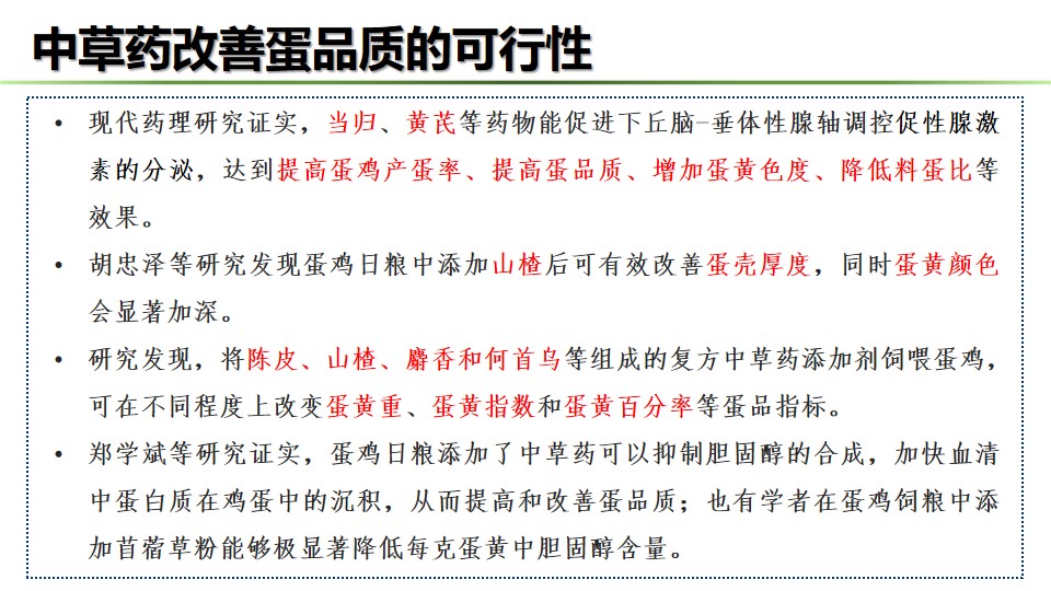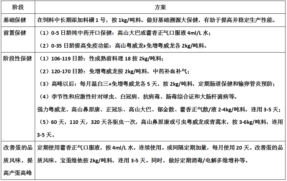 對于養蛋雞來說,蛋雞生產,必須安全、優質,也就是說既要無抗,又要好看,更要好吃。要想高產,穩產,蛋好,多蛋,主要做好“以養為主,以防為輔”的基本保健方針,按照“1+3+1”健康養殖理念與思路,全程堅持用好中藥,做好產健康蛋、產優質蛋和多產蛋的綜防工作,從根本上有助于實現蛋雞健康、高產和高質等三大問題,有助于提高產蛋高峰、延長產蛋高峰,更能改善蛋的品質風味。