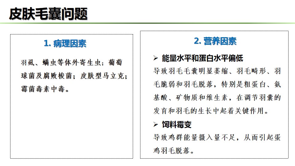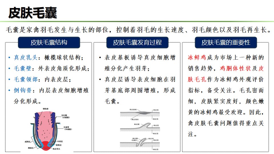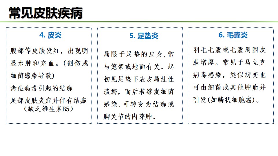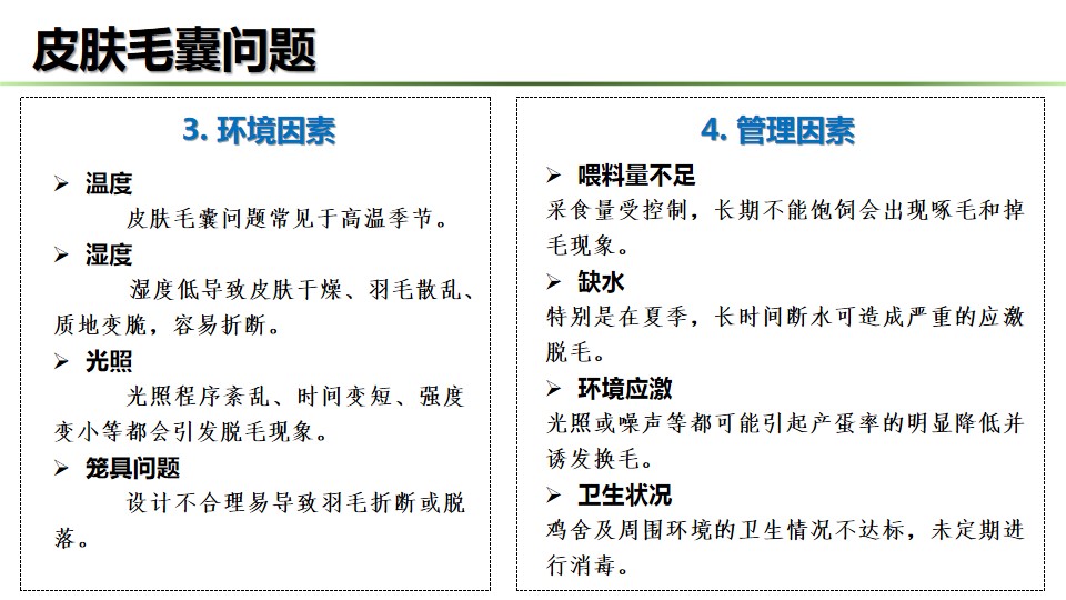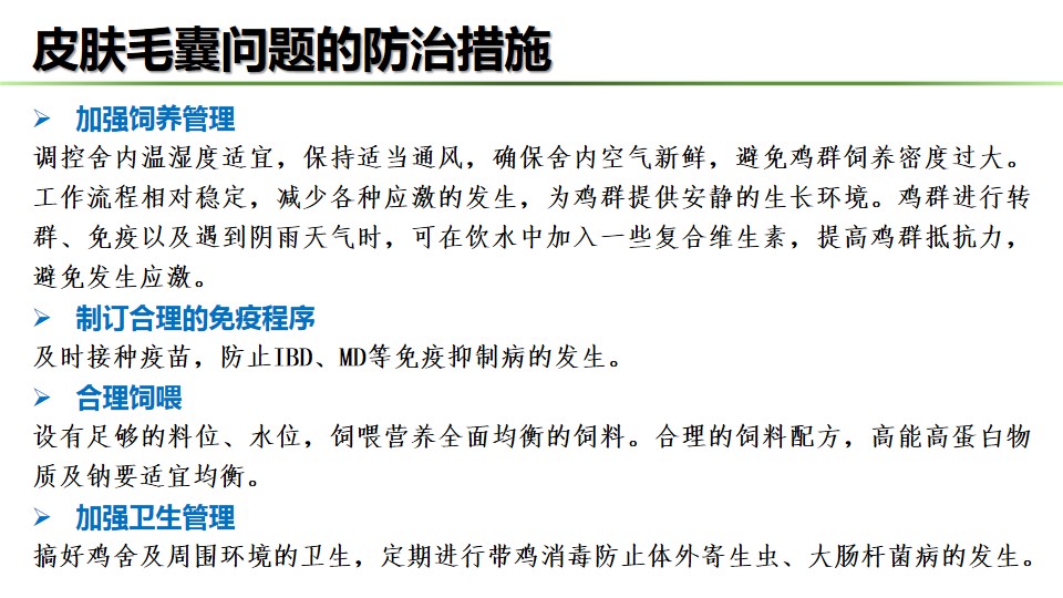 皮膚毛囊問題的防控措施之一是搞好雞舍及周圍環境的衛生,定期進行帶雞消毒防止體外寄生蟲、大腸桿菌病的發生。
