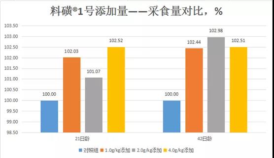 平均日采食量比較分析:商品肉用雞前期(1-21d)添加信宜金方子生物科技有限公司料磺1號可以增加平均日采食量;商品肉用雞中后期(21-42d)添加信宜金方子生物科技有限公司料磺1號可以增加平均日采食量,結果與對照組之間無顯著差異(P>0.05)。