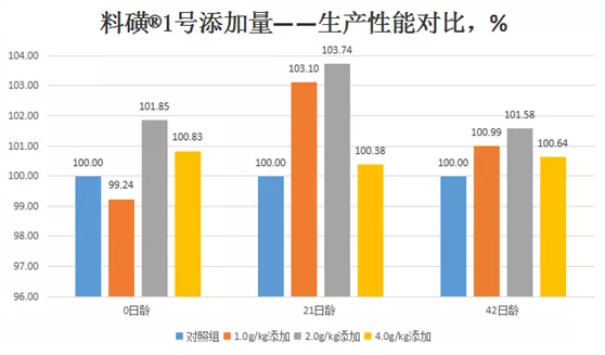 3.2與對照組相比,試驗組商品肉雞在(1-21d)/(21-42d)在死亡率方面略有下降,無顯著差異(P>0.05),說明料磺1號在試驗添加量(1.0、2.0和4.0g/kg)可獲得與對照組一致的生產性能,在肉雞的日常飼養方面具有替代抗生素,一定程度的減少疾病發生作用。